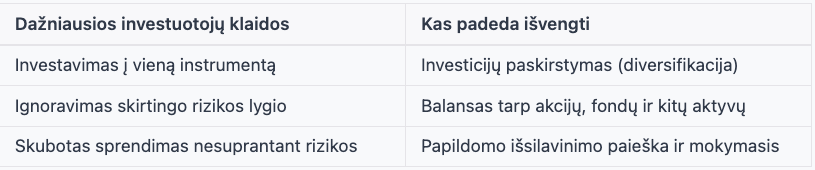 Pradedantieji investuotojai dažnai pradeda investuoti turėdami ribotas žinias apie rinkas ir investavimo priemones, tačiau susigundo pelningomis investicinėmis galimybėmis, kurių rizikos iki galo nesupranta. Tai gali lemti netinkamus sprendimus ir didesnius svyravimus ar net investicijų praradimą. Svarbu nuolat mokytis apie finansų rinkas, sekti naujienas ir skirti laiko savo portfelio peržvelgimui.